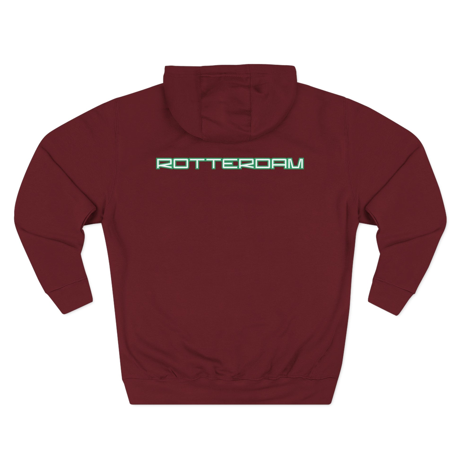 This midweight fleece hoodie brings a quiet, modern nod to city pride. The clean white canvas puts a slim, neon-green ‘ROTTERDAM’ wordmark across the chest and upper back, while a simplified heraldic shield sits centered on the front — a subtle mix of collegiate crest and contemporary streetwear. The fabric feels soft and slightly plush against the skin, with a roomy kangaroo pocket and an adjustable hood that tucks you into warmth on cool walks through damp harbor air. It sits straight across the body (regular fit) and wears like a lived-in favorite after just a few outings. Whether you’re wandering markets, meeting friends for coffee, or layering under a coat, this hoodie reads like a local’s quiet statement — comfortable, unassuming, and unmistakably tied to place.