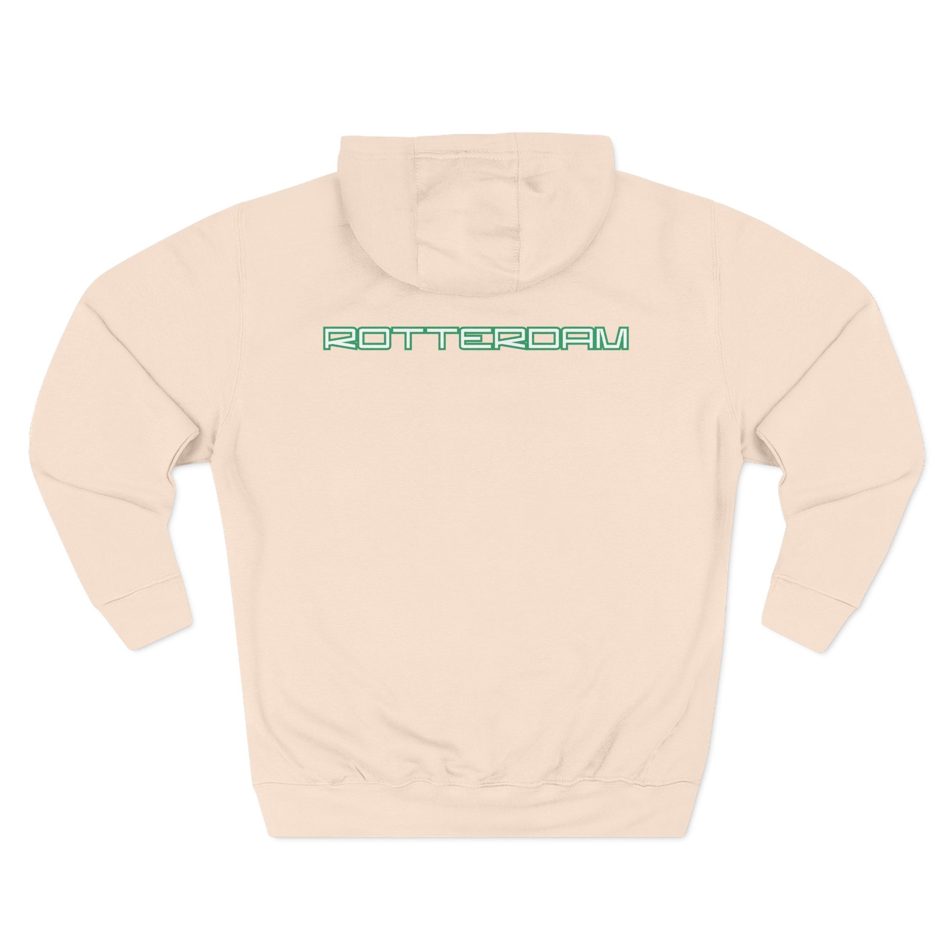 This midweight fleece hoodie brings a quiet, modern nod to city pride. The clean white canvas puts a slim, neon-green ‘ROTTERDAM’ wordmark across the chest and upper back, while a simplified heraldic shield sits centered on the front — a subtle mix of collegiate crest and contemporary streetwear. The fabric feels soft and slightly plush against the skin, with a roomy kangaroo pocket and an adjustable hood that tucks you into warmth on cool walks through damp harbor air. It sits straight across the body (regular fit) and wears like a lived-in favorite after just a few outings. Whether you’re wandering markets, meeting friends for coffee, or layering under a coat, this hoodie reads like a local’s quiet statement — comfortable, unassuming, and unmistakably tied to place.